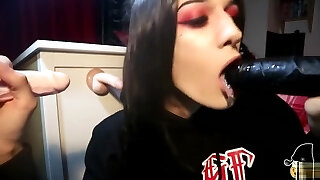 Possessed Goth Tranny Trap Sucks Trio Cocks Sloppy Bukakke Deepthroat Footjob
